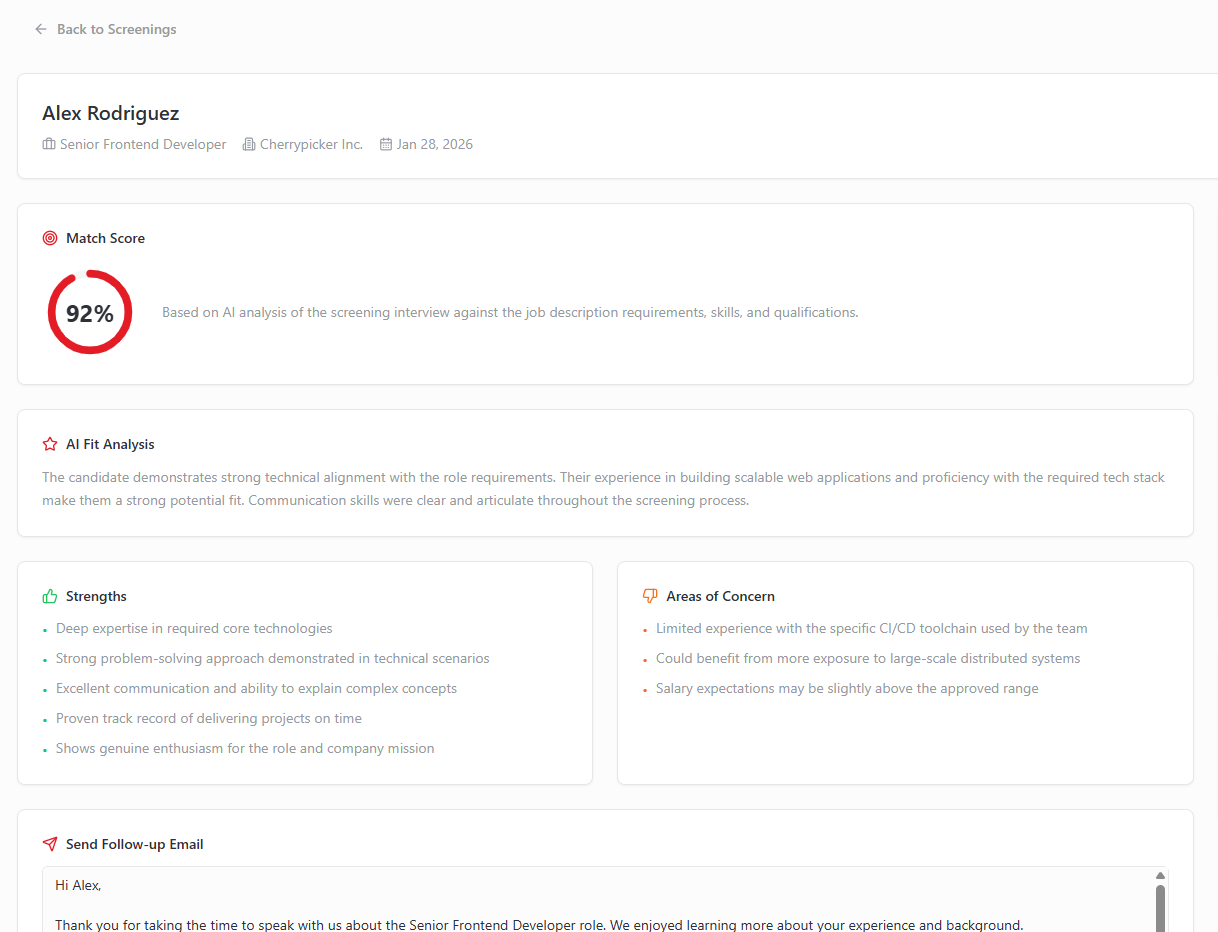 Cherrypicker performs AI-assisted video or phone screenings for you.
